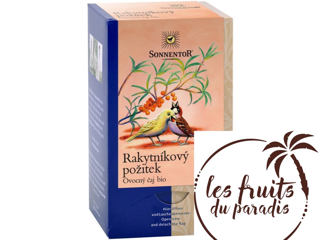Rakytníkový požitek – ovocný čaj – „vášnivý čajový zážitek“. Blahodárně působící jemná ovocná směs. Užijte si aromatického rakytníku převážně ve studených zimních měsících. Studené ovocné čaje jsou skvělým osvěžením, ledově vychlazené, ochucené ovocnými sirupy. Můžete si také vykouzlit vlastní ledový ovocný čaj! Ovocné čaje k jídlu: Jemnější, sladké ovocné čaje jako Rakytníkový požitek skvěle chutnají k čerstvému sýru s medem, k jarním salátům s čerstvými květy nebo ke sladší zelenině, jako je mrkev a červená řepa. Právě tento čaj výborně chutná také k jablečno-skořicovým dezertům a ovocným variacím mléčné rýže.